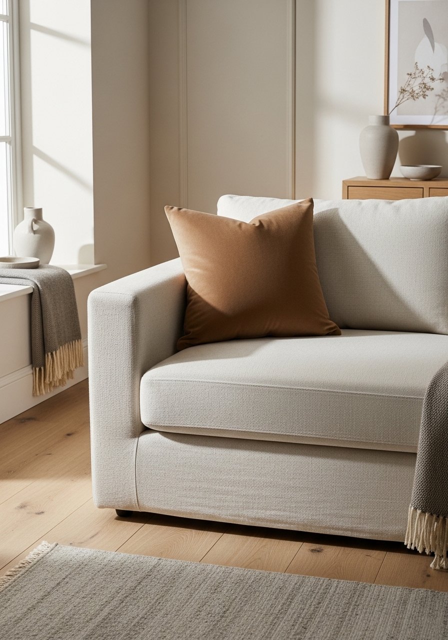 Match the pillow tone to the room’s mushroom or taupe accents. Keep shapes simple — an 18" square is usually right.