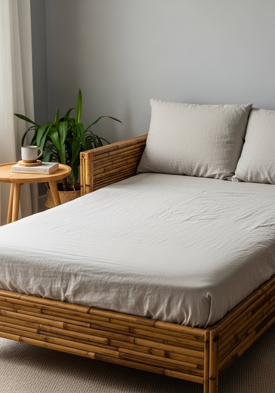 I needed a guest bed without a spare room. A low bamboo sofa bed solved that and kept the lounge vibe calm.