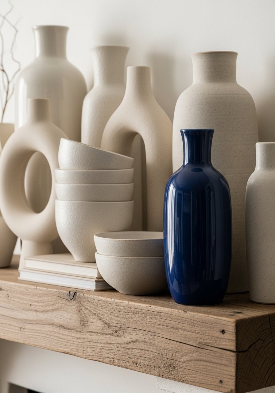 Layered neutrals feel calm and grounded. I placed ceramic vases in varying heights—white, sand, and taupe—and added one navy vase for a pop. I used this ceramic vase set and a stack of neutral coffee table books to vary height. The result: quiet sophistication. Mistake to avoid: matching every piece exactly; you want contrast. Use odd numbers and vary textures—linen, clay, wood—for depth and a relaxed, curated look.