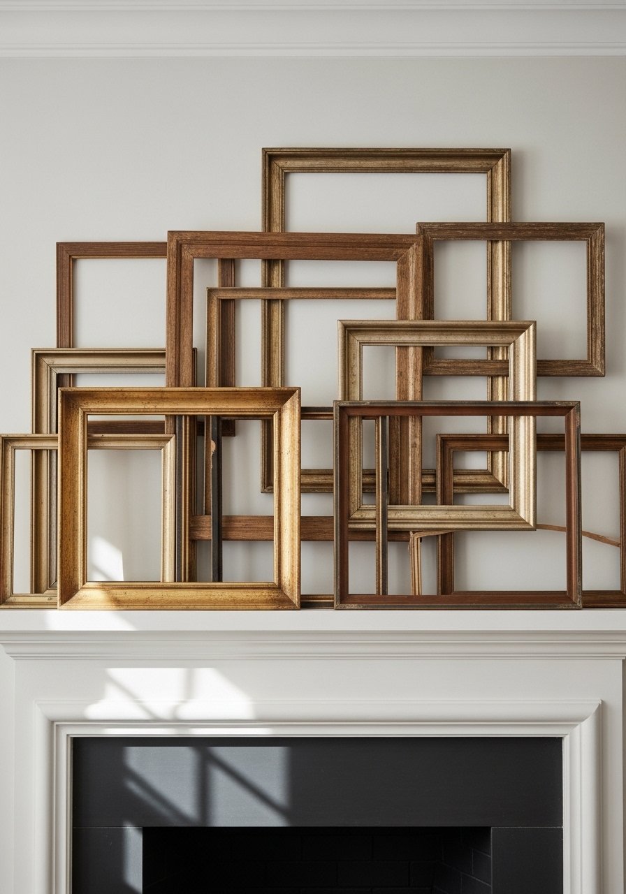 A: Keep the bottom of the art 4–6 inches above the mantel shelf. For tall ceilings, increase spacing slightly. For renters, lean a piece instead—these mixed metal frames are easy to style without hardware.