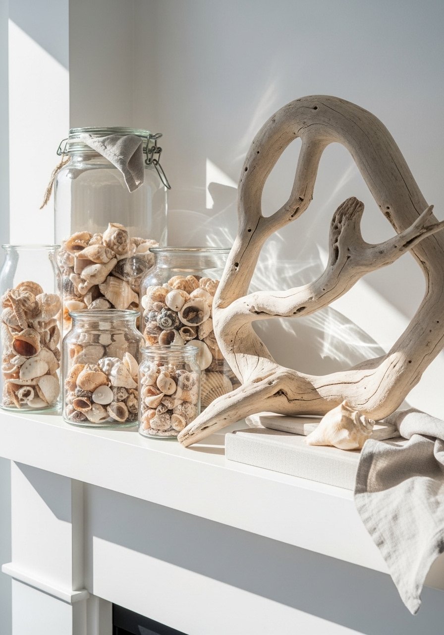 For a coastal vibe, group shells in clear jars, add driftwood, and use soft blues. I filled a tall glass jar with shells and added a small driftwood bowl; a glass hurricane vase works well. Mistake: overcrowding with kitschy items—keep palettes muted. Coastal mantels should feel airy and curated, not like a souvenir shop.