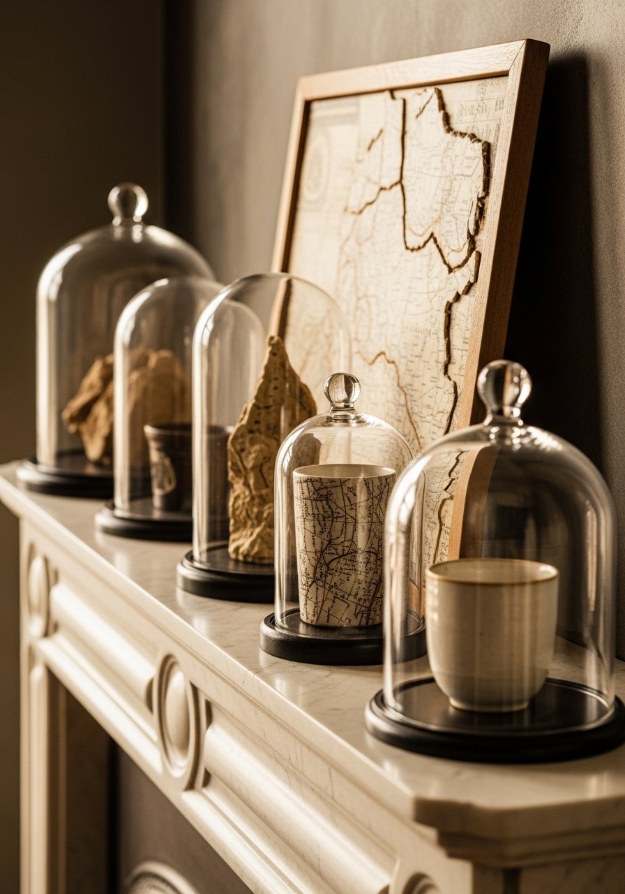 Display small curios in groups: shells, antique keys, or ceramic shards. I used a glass cloche set to highlight tiny finds. Mistake: scattering items randomly—group them in a tray or cloche for cohesion. Curios tell a story and make the mantel feel personal.