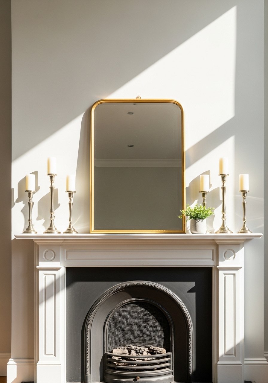 Symmetry reads polished. I used a centered mirror and matching brass candlesticks with equal vases at each end. This works well over a fireplace to create calm and order. Mistake: forcing symmetry when the mantel is uneven—measure before buying. Symmetrical styling gives a formal, edited appearance without being cold when you add warm textiles nearby.