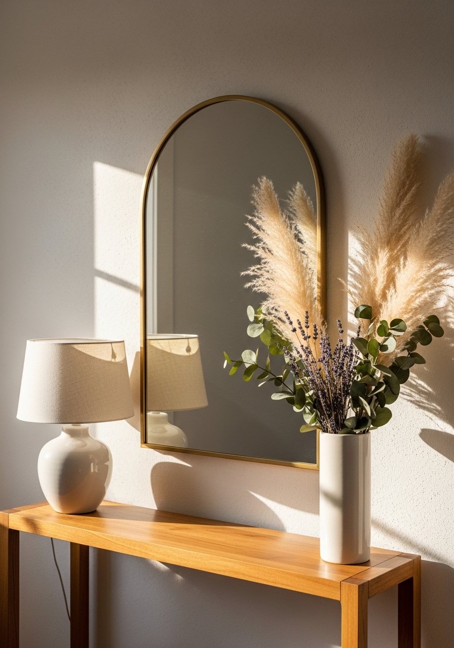 An arched mirror adds architectural interest and lifts a console by drawing the eye up. I love the softer silhouette over squared furniture; it makes ceilings feel higher. I used this arched wall mirror in aged brass. Avoid hanging it too close to clutter. Keep a 2–3 inch gap to the console for a breathable vignette, and balance with a tall plant on one side for scale.