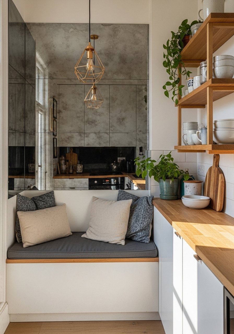 A mirrored backsplash magnifies natural light and visually expands narrow kitchen corners. I installed a small mirrored panel behind open shelving above a breakfast banquette and the area felt twice as deep. Use kitchen mirror panels sized for behind counters. Mistake: avoid full-height mirrors behind cooktops unless sealed — stick to decorative or low-heat areas. Add warm wood and rattan accents to soften reflective surfaces.
