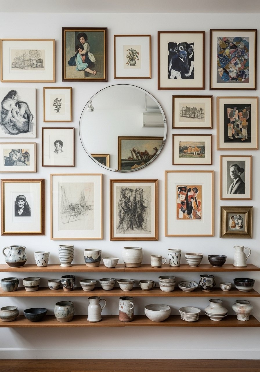 Mixing mirrors within a gallery wall breaks up artwork and creates focal pops that reflect light. I integrated a 20-inch round mirror amid prints and it made the whole arrangement feel dynamic. Use decorative round mirror. Mistake: don’t overcrowd — maintain breathing room around the mirror so reflections register. Use varying frame sizes and keep a unifying color or material to tie it together.