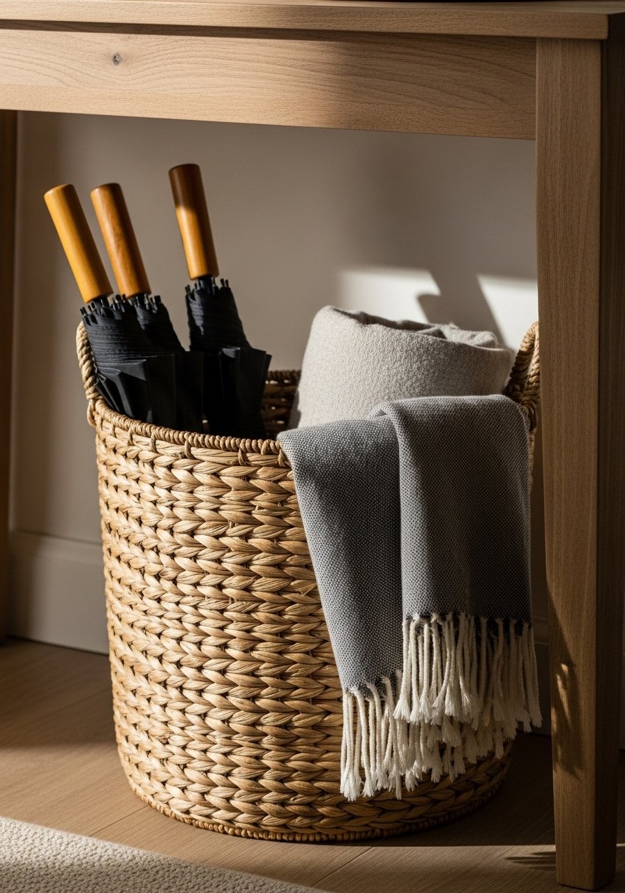 Baskets are the easiest way to hide shoes and kid gear. I use one large seagrass basket per household member to avoid mixed piles. A common error is using too many small baskets which looks messy. Use one statement basket on the floor and a couple of small woven trays on the console for keys. Buy a large woven basket about 14-18 inches wide. In small foyers choose flatter baskets to keep the path clear.