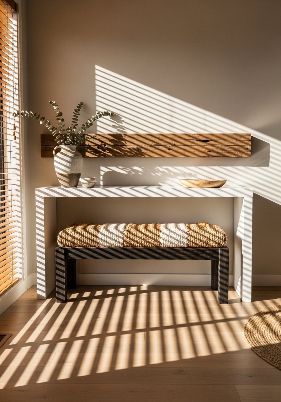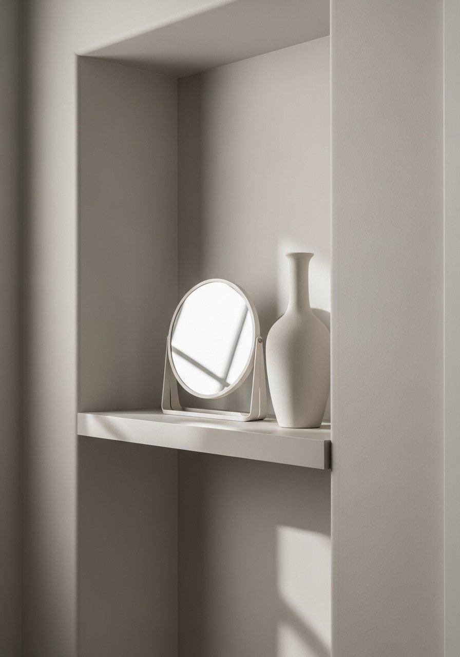 A niche turns an awkward indentation into a designed moment. I painted mine a soft warm gray to set off a white oak shelf. The paint color creates depth in photos and real life. People often overfill niches. Keep one focal object and negative space. Install a small light above to highlight the display. I used a small puck LED light inside the niche. Choose shelf depth under 10 inches for narrow entryways.