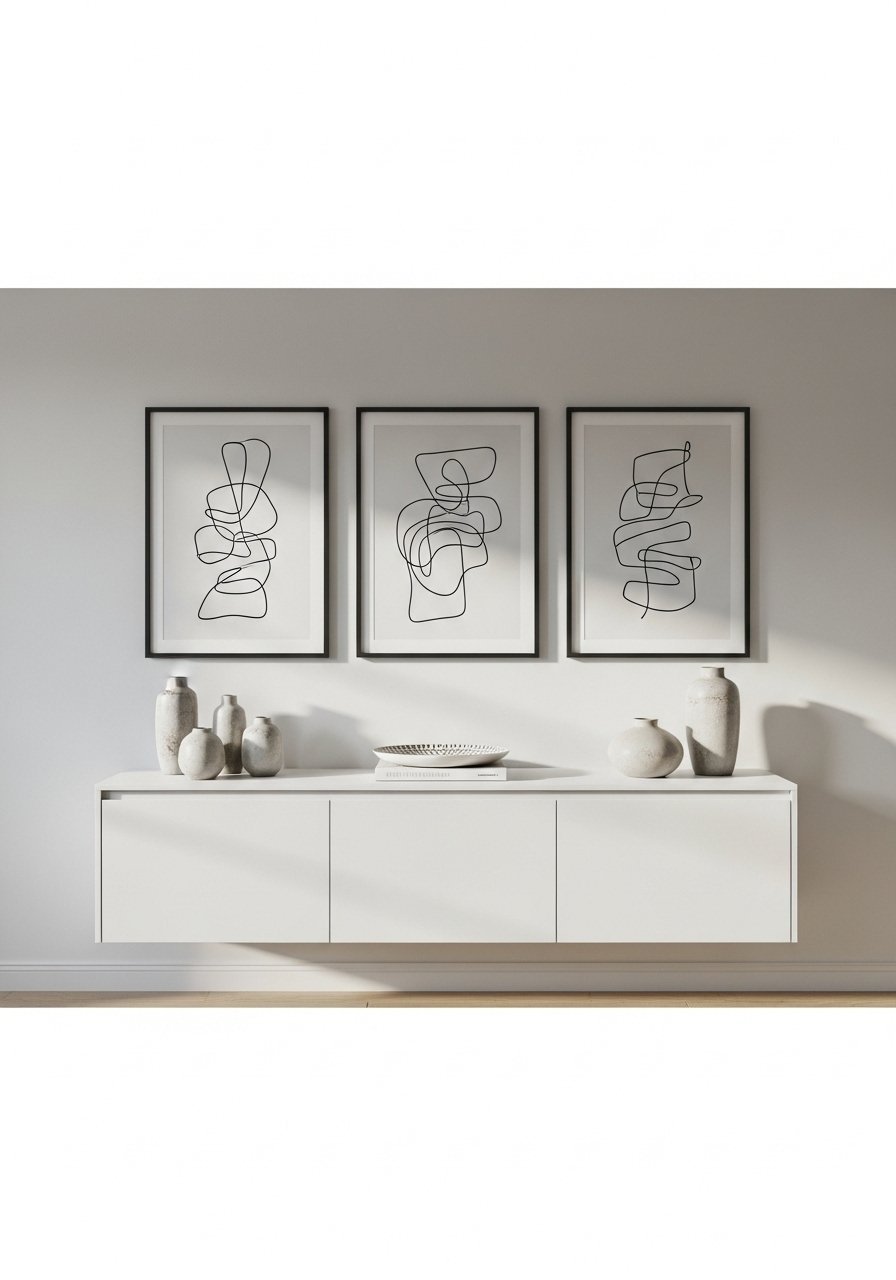 Minimalist Line Art Grouped Above a Floating Credenza