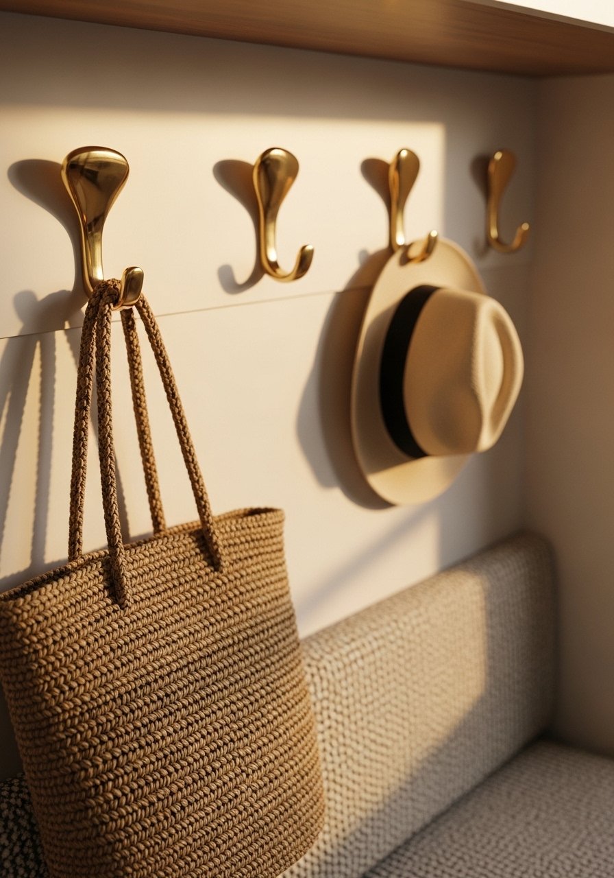A set of sculptural hooks replaced a crowded coat rack in my entry. It functions and serves as art. Works best in entries and mudrooms. Budget $25 to $80. Choose hooks with a matte finish to avoid fingerprints. A common mistake is placing hooks too low. Mount them at shoulder height for easy reach. I installed brass sculptural wall hooks. In photos hooks look perfectly spaced. In real use leave extra room for bulky coats.