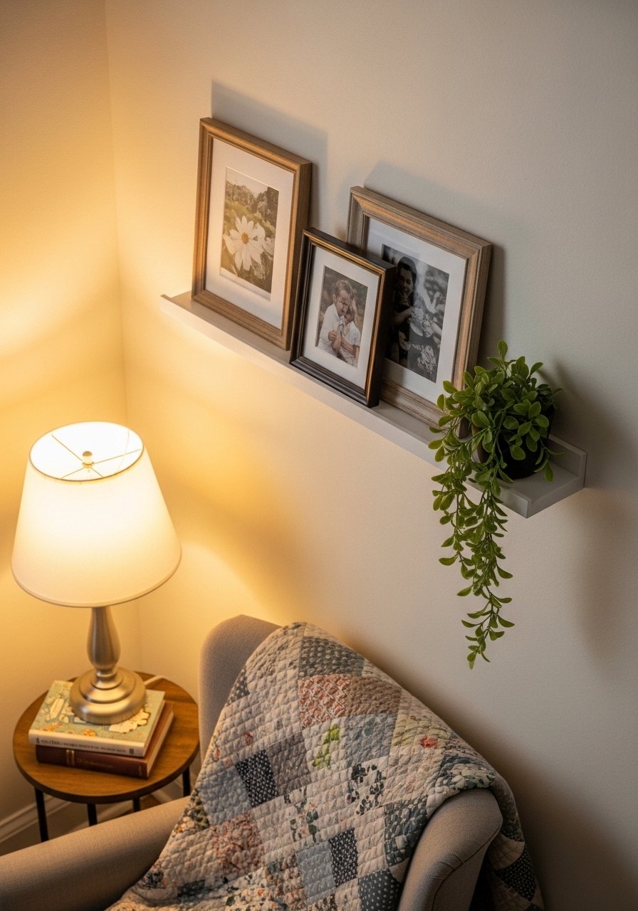 Layered Frames on a Narrow Ledge for a Cozy Reading Nook