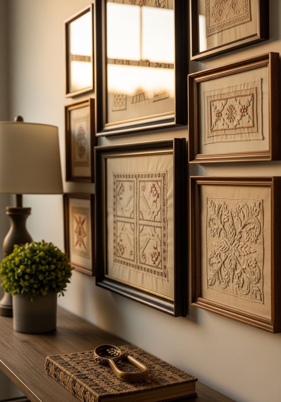 I framed vintage scarves and small textiles and they read like thoughtful art. Good for living rooms and hallways. Budget $25 to $150 depending on mats and frames. Use archival backing and wide mats to let textiles breathe. Avoid stretching delicate fabrics too tightly. I sourced affordable frames and used matted frames 11×14. In photos texture pops. In person the backing and mat choice affects how flat the textile appears.