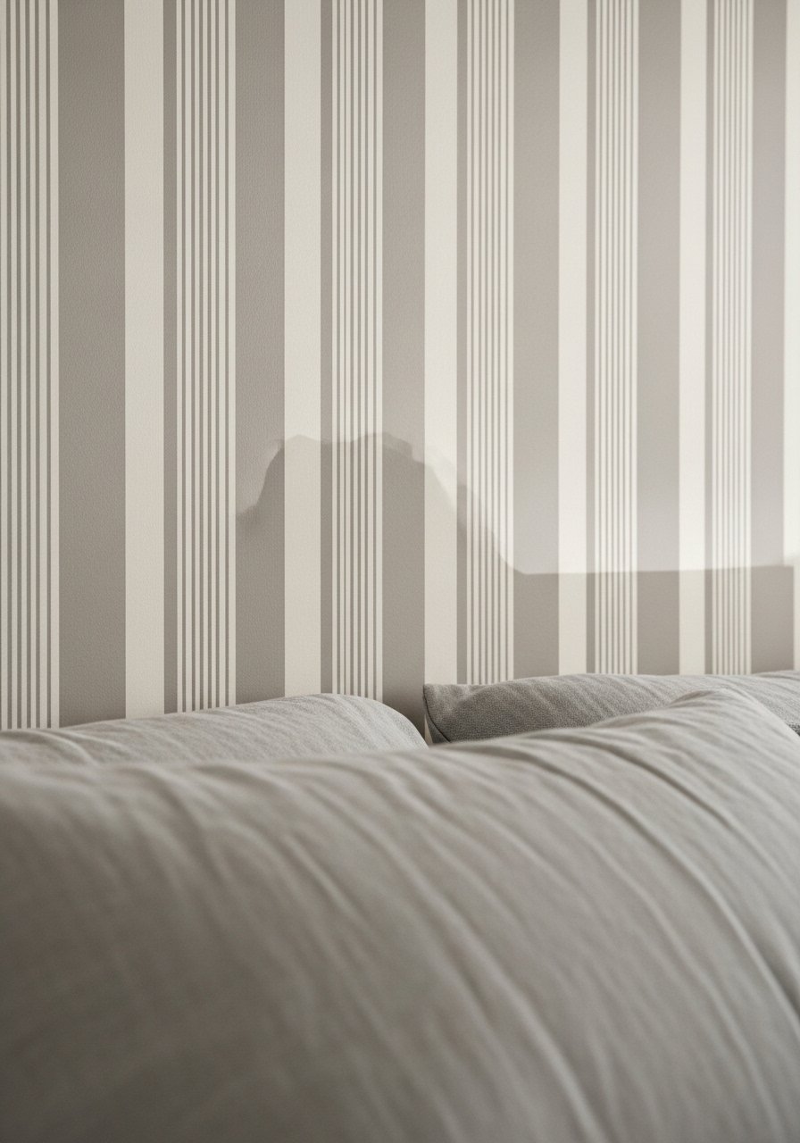 I used a vertical stripe peel-and-stick behind my bed and it made the ceiling feel taller. Stripes should be subtle, under two inches wide, for a calm look. I applied one roll as an accent and paired it with plain linen bedding. Peel and stick stripe wallpaper neutral taupe is $30 to $45. Avoid high-contrast stripes. They read busy in real life.