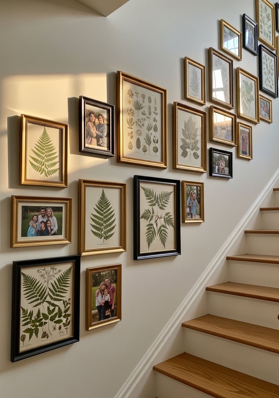 I collected frames from thrift stores and unified them with fresh white mats. The mix reads layered and intentional. I keep the eye path flowing by staggering top and bottom frames along the stair angle. Assorted vintage-look frames set is about $50. The common mistake is too many ornate frames. Mix in simpler frames to avoid a dated museum feel.