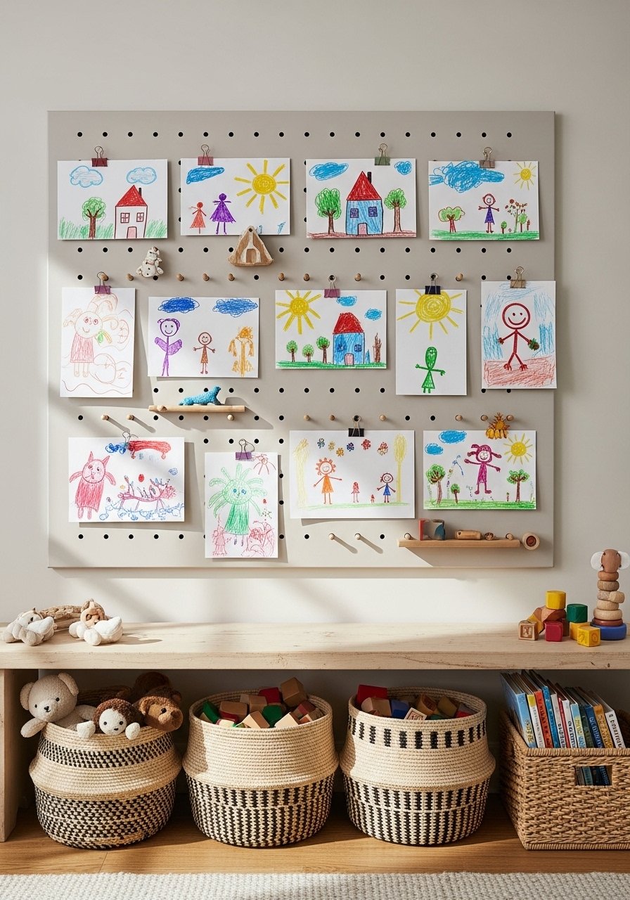 Pegboard Gallery for Rotating Kids Art in a Playroom