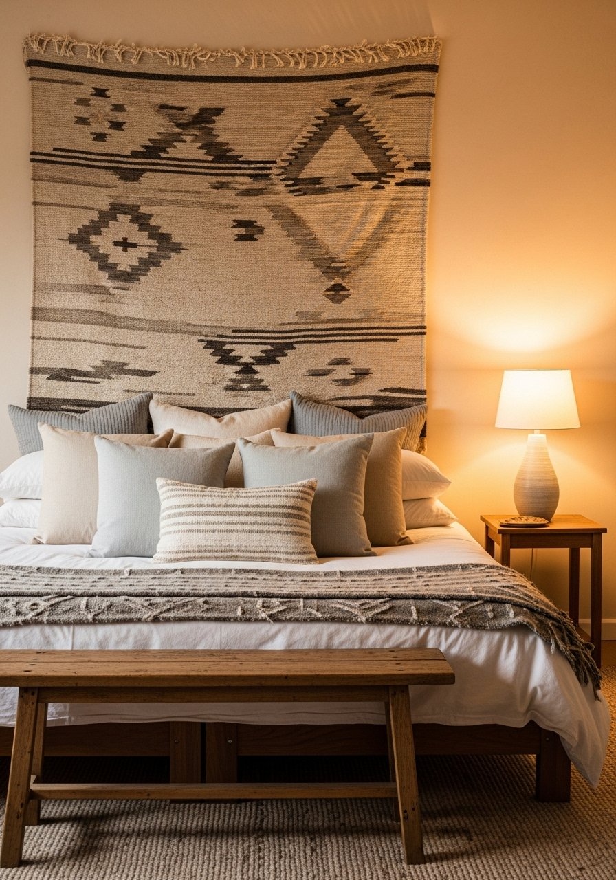 A tapestry can replace a bulky headboard and soften the room. I chose a 60×80-inch woven piece in cream and warm taupe. Hang it so the bottom grazes the mattress top. Woven wall tapestry neutral 60×80 is about $70. In photos tapestries look dramatic. In practice pick a washable fabric for bedrooms. Avoid synthetic shine which reads cheap.