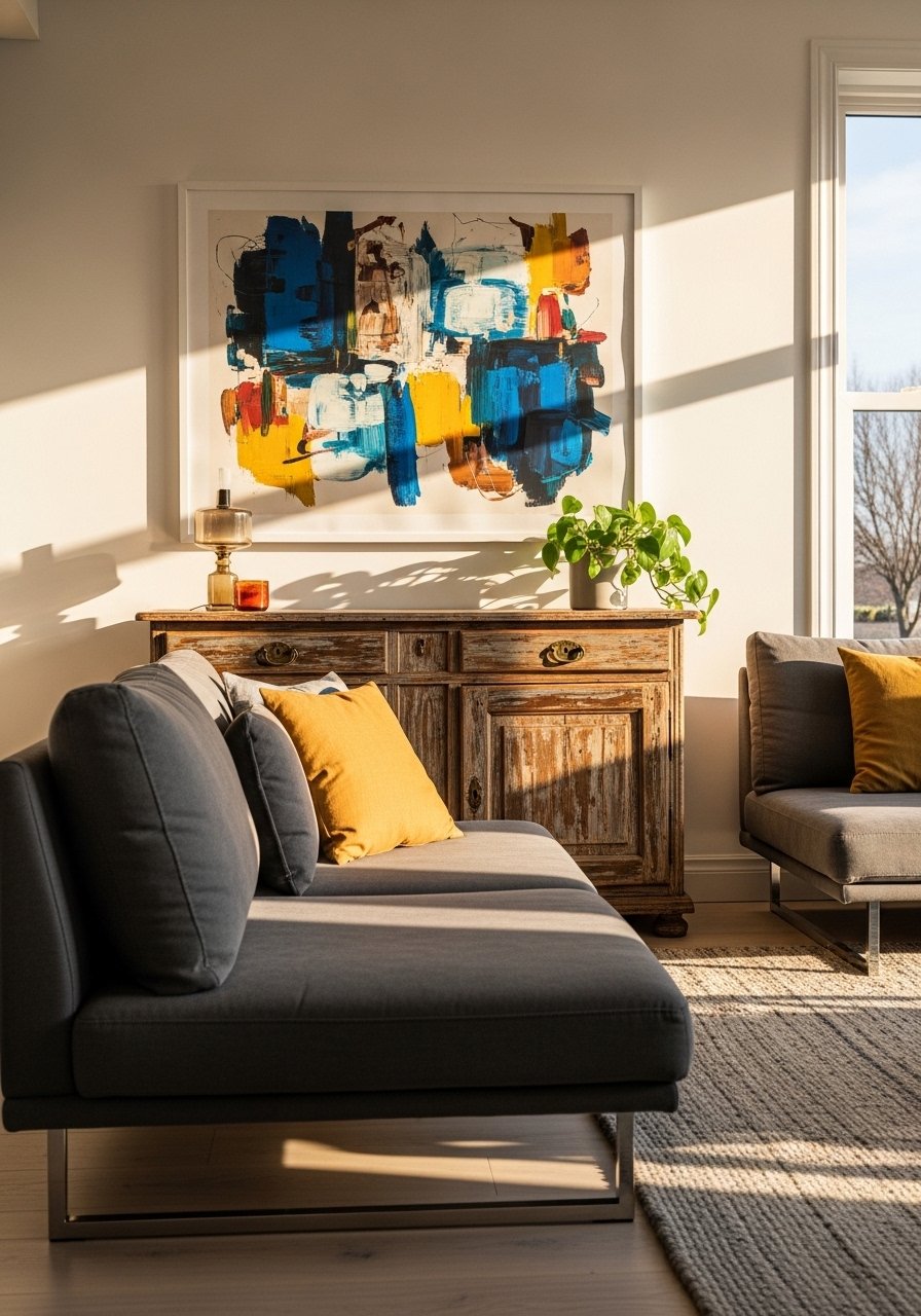 I bought a streamlined sofa and panicked it felt cold. Then I hunted down a battered cabinet and the room clicked. The cabinet anchors the sofa and tells a story.