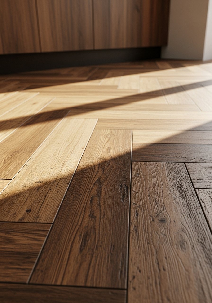 I swapped worn vinyl for wood-look herringbone tile and the kitchen felt grounded. The pattern adds sophistication while staying honest and rustic.