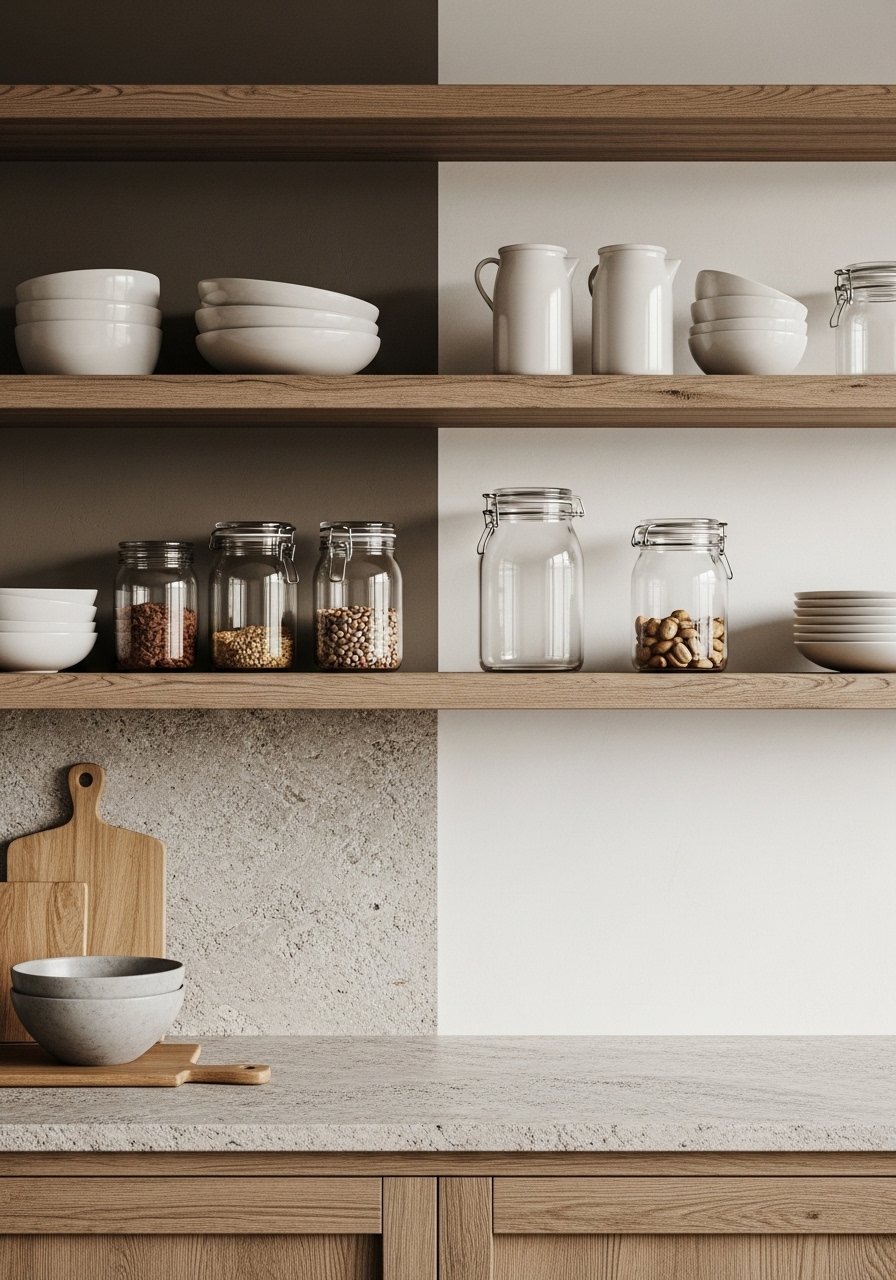 Style sparingly. Open shelving should feel curated. I follow a 50/50 rule—half items, half breathing room—so it never looks like clutter.