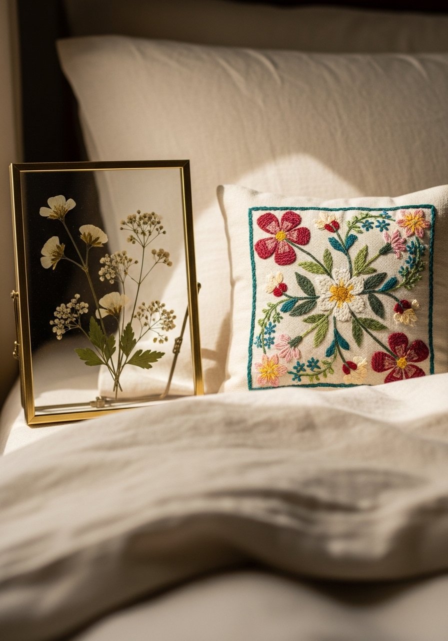 I learned to use florals quietly. A pressed flower frame or a delicate embroidered pillow adds spring softness without shouting pattern.