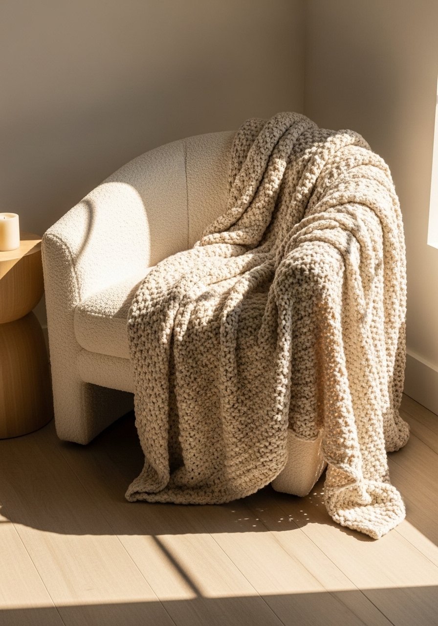 Pay attention to scale. Big sofas want larger throws. Keep colors warm: cream, warm beige, soft sage. Small mistake to avoid: don’t match everything—vary texture.
