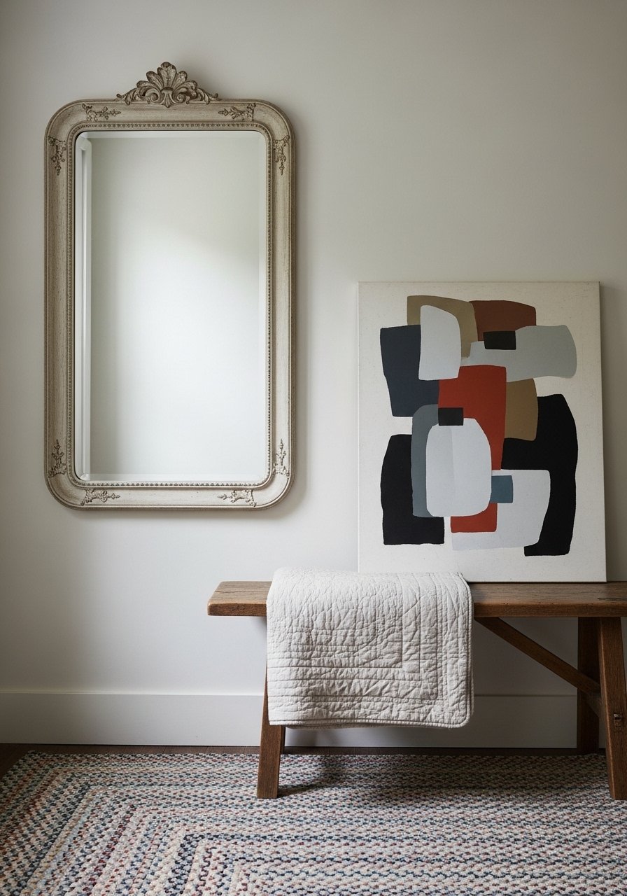 I love a braided rug and an old mirror. Placing contemporary art above a primitive piece keeps it from feeling stagey. It reads like history, not a costume.