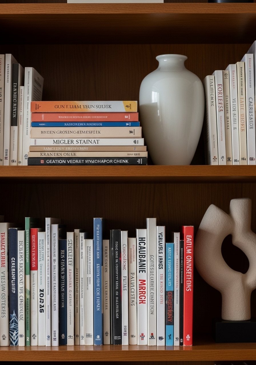 I alternate stacks of books laid flat with rows standing upright. The horizontal stacks act as mini pedestals for a ceramic vase and a candle. Using book spines to echo a color family creates cohesion. Mistake to avoid: relying only on color—vary texture and height to keep it tactile. Mixing orientation helps on narrow shelves where depth needs visual interest.