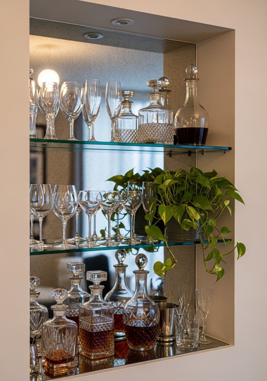 Adding a mirrored panel to the back of a deep shelf reflects light and doubles the visual depth. I used a 24×36 mirror panel behind glassware and light ceramics. This large round mirror also works leaned on a deeper shelf for the same effect. Mistake: cluttering mirrored backs—simple, reflective displays look best. The reflection makes the room feel bigger and brighter in a subtle way.