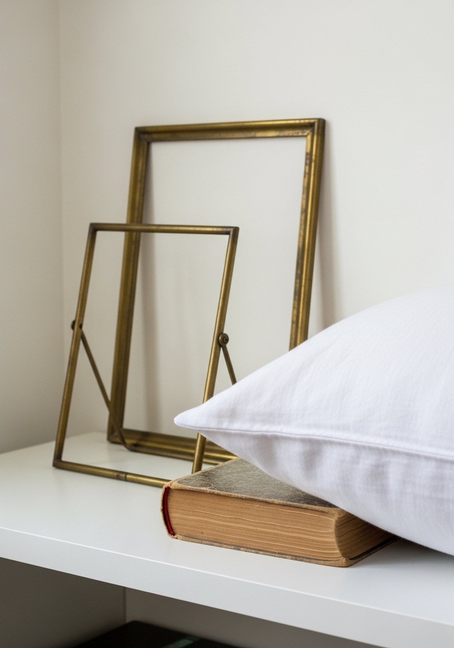 I love the tension of thrifted vintage objects against crisp linen and white ceramics. On my bedside shelf, a small vintage frame sits next to a folded linen pillow and a neutral ceramic bud vase. Mistake: over-cleaning vintage—patina is part of the charm. This contrast reads collected and personal, not styled-for-show.