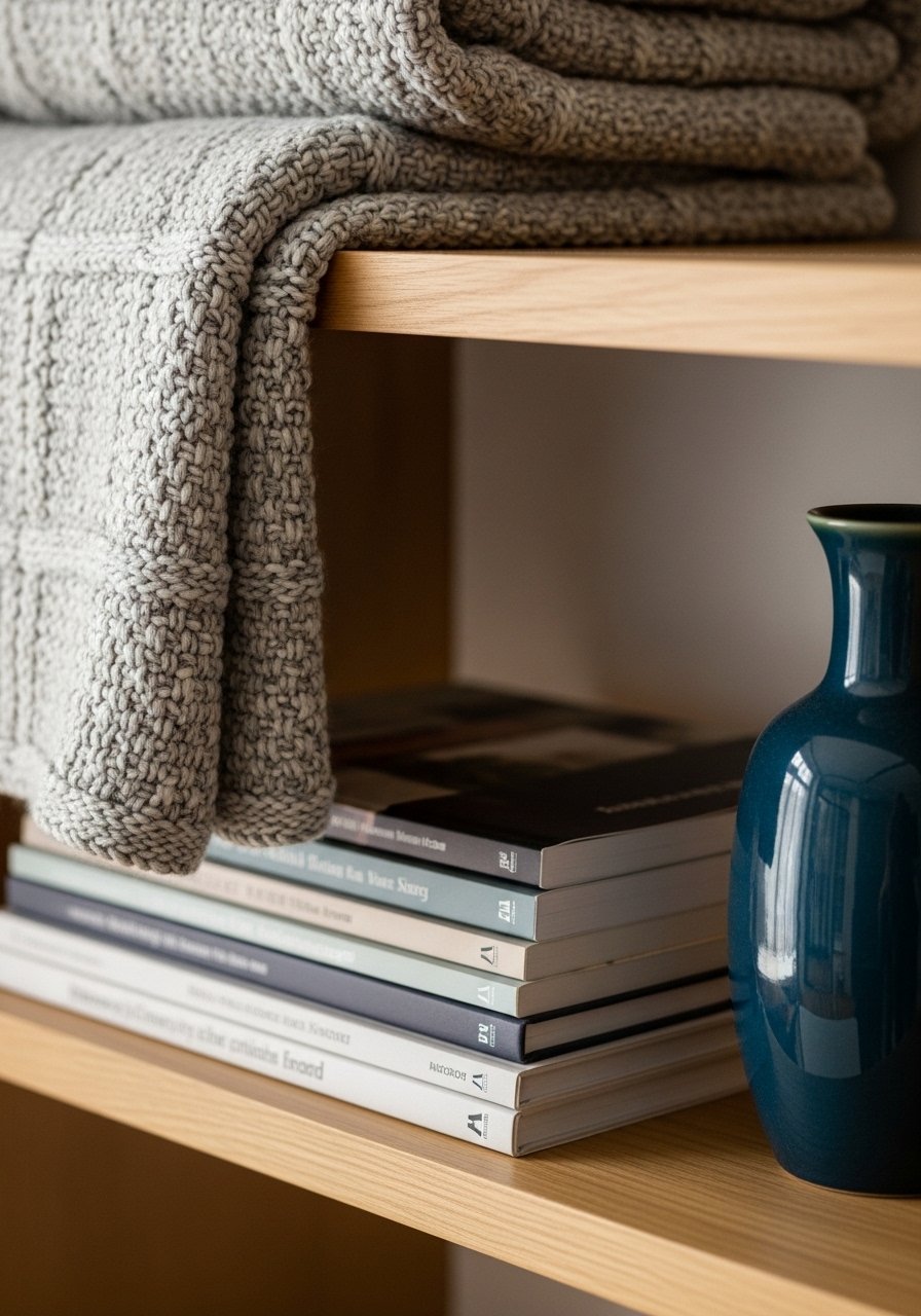 Draping a soft textile over the shelf edge instantly adds warmth. I fold a cream chunky throw so only a small tail hangs down; it softens the shelf line and invites touch. I used this cream chunky knit throw. Mistake: letting the drape look sloppy—keep the fold neat and show only a bit for a curated, cozy feel.