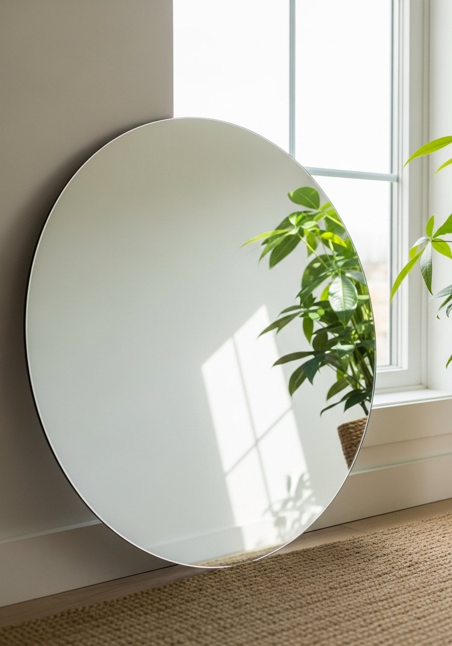An oversized round mirror bounces light and visually doubles space. I propped this 36-inch round mirror against a dim wall and the room felt brighter within hours. Mirrors work best opposite a window or next to a light source. Don’t hang small square mirrors on a big plain wall — they can emphasize scale problems. A single large piece reads cleaner and keeps the room airy.