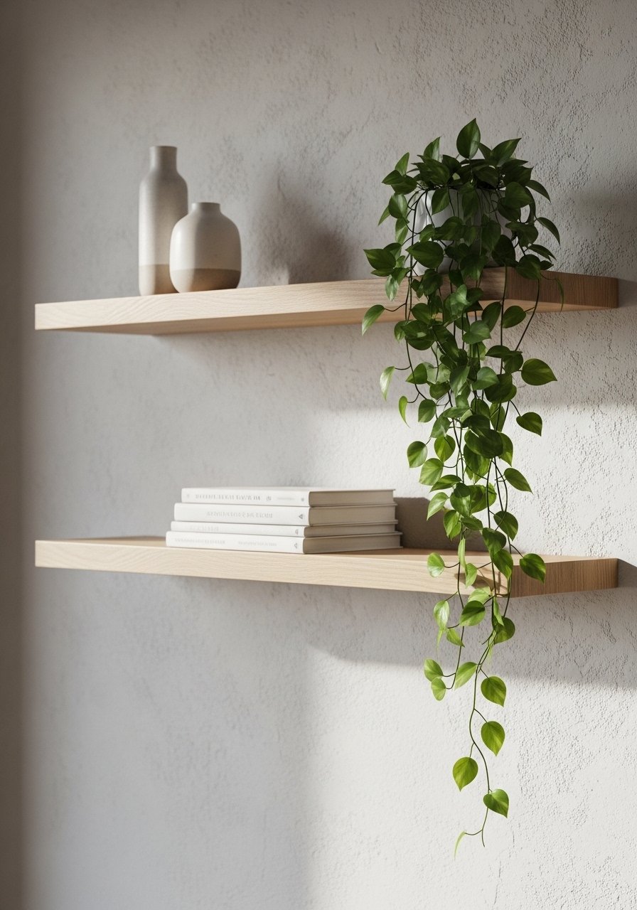 Floating shelves free up floor space and create vertical interest. I installed white oak floating shelves in an odd-number grouping and balanced plants with framed prints. The key is editing: one trailing plant, two art pieces, and a small ceramic bowl keeps the shelf from looking cluttered. Avoid overcrowding; too many small objects read chaotic. Aim for height variation and odd numbers for a relaxed, intentional display.