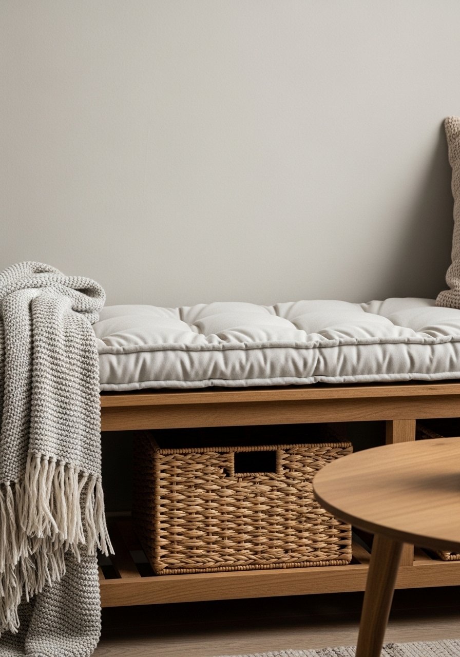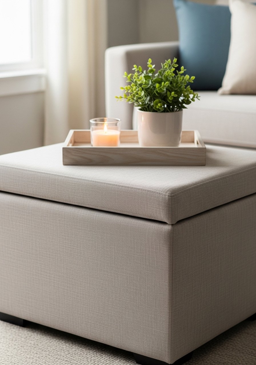 A storage ottoman gives seating, a coffee table surface, and hidden storage in one. I keep blankets and kids’ toys inside and use a wooden tray for drinks. Pick a piece about 36 inches long for balance. Avoid ottomans that are too low or too plush — they read like a floor cushion and reduce usable surface. Neutral upholstery pairs with seasonal pillows to change the vibe quickly.