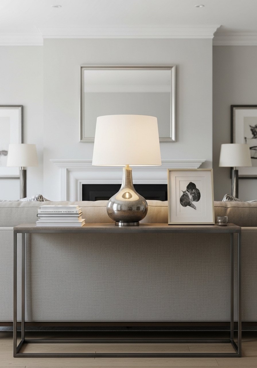A narrow console behind the sofa creates separation and gives room for a lamp and drop-zone. I scored a 12-inch-deep console at Target and it fits without crowding the walkway. It’s perfect for a slim table lamp and a tray for keys. Avoid bulky consoles wider than 18 inches in narrow rooms — they block the visual openness. Keep styling low and horizontal to maintain sightlines.
