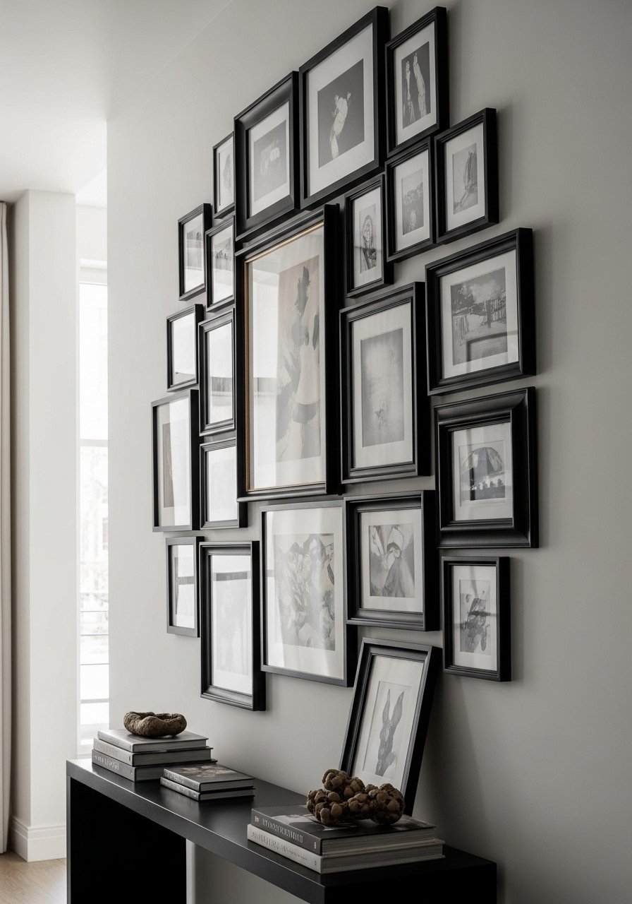 A vertical gallery wall stretches a wall visually. I picked 3-5 black frames in different sizes and stacked them with 6-inch spacing. It feels curated, not busy. Use consistent matting or frame color to keep cohesion. Don’t scatter small pieces randomly; vertical alignment works best in tight spaces. This draws the eye up and makes ceilings read taller. Thrift frames and buy new mats for a refined look.