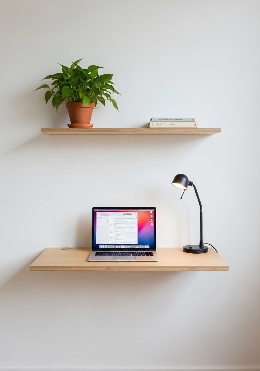 A floating desk acts like a built-in without renovation. I installed a 30-inch floating top paired with a slim wall lamp and it functions as work and styling surface. Use a slim chair that tucks in and keep cables hidden with adhesive clips. Avoid putting a bulky desk in an open living room; it will eat floor space. This solution keeps the footprint minimal and doubles as a console when guests arrive.