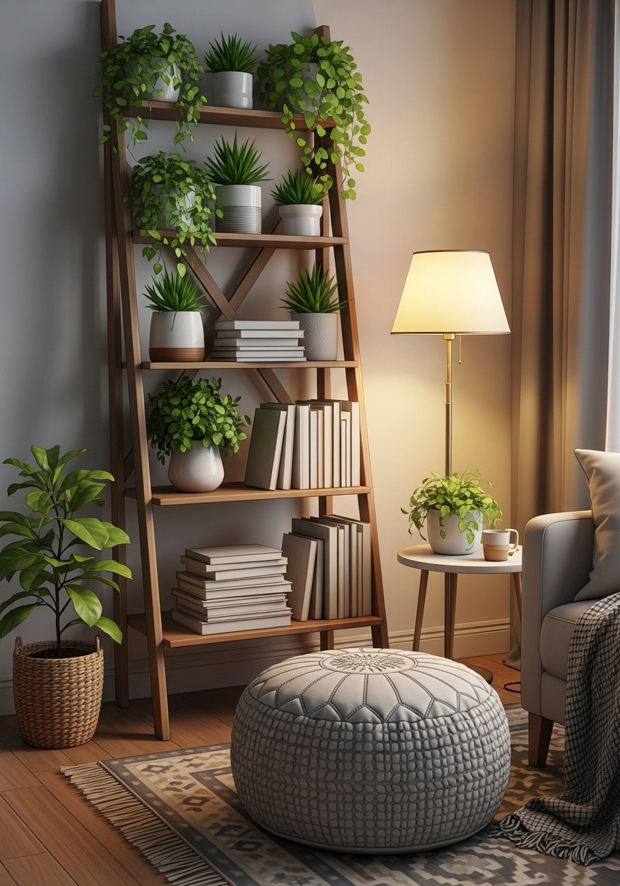 Carving a corner into a reading nook adds function and charm. I paired a ladder shelf with a textured pouf and a floor lamp to save space. Use a slim-profile lamp and a pouf that tucks under the shelf when not used. Don’t crowd the nook with a big armchair — scale down to keep flow. This creates a cozy zone without blocking pathways and makes every square foot count.