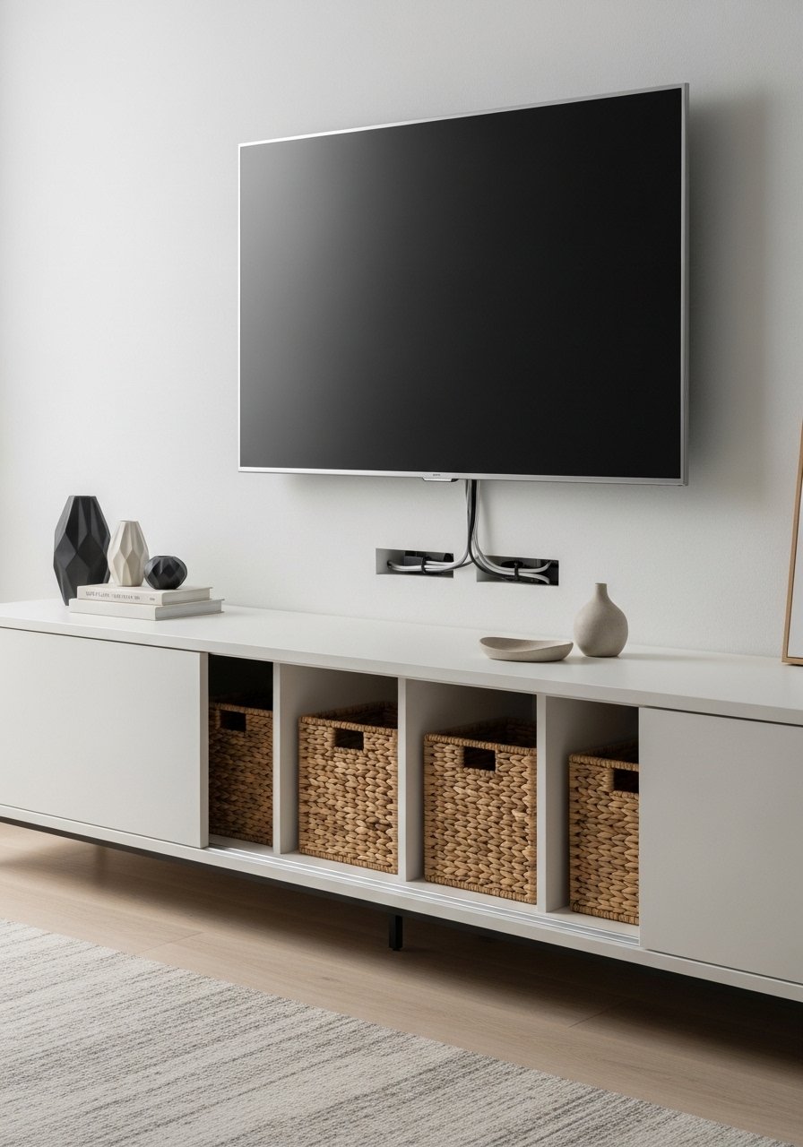 A low media cabinet keeps the TV at eye level and conceals gear. My cabinet has sliding doors and three baskets for remotes and consoles. Choose a piece no taller than 22 inches to keep sightlines open. Avoid tall, bulky armoires near the TV — they dominate the room. A low unit plus a wall-mounted TV visually expands the wall and keeps the floor accessible.