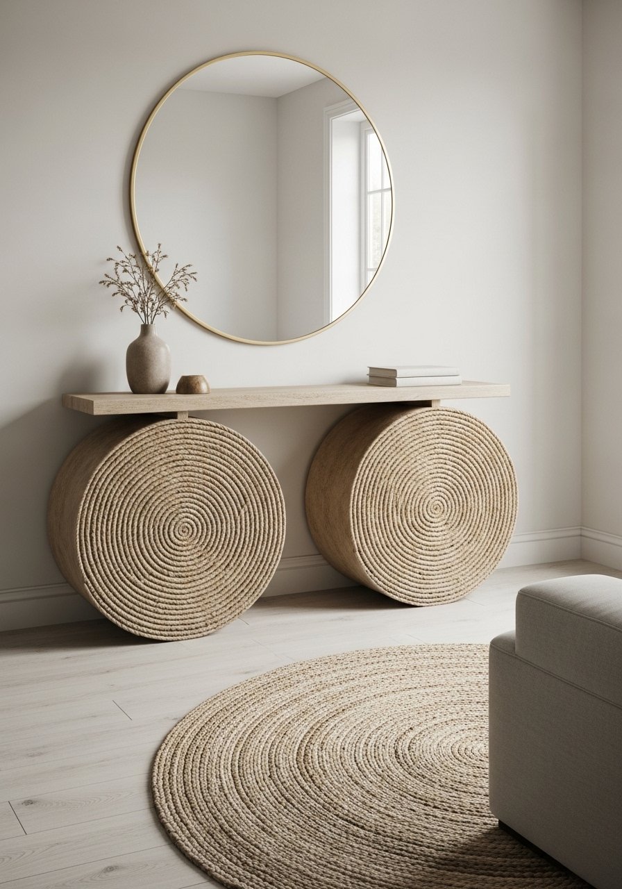Circles soften corners and encourage movement. I paired a round jute rug with a round mirror above the console to create a flow that makes the room feel less boxy. Round shapes break up rectilinear furniture and invite the eye to move around. Avoid too many competing patterns in small rooms; keep shapes simple and textures varied. The combo adds a subtle organic note that feels relaxed and intentional.