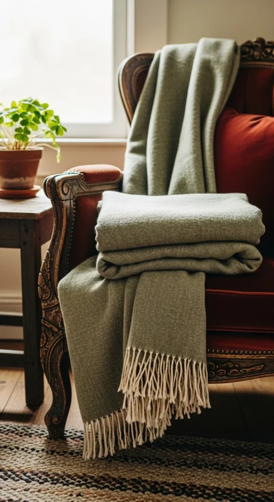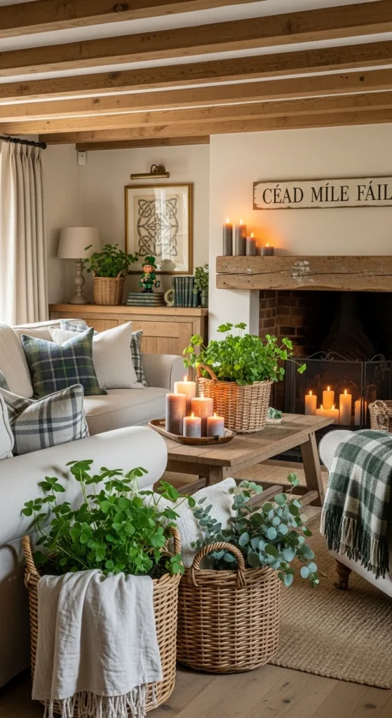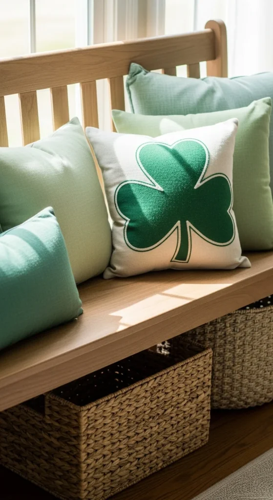 A soft green linen throw instantly adds cottage charm and St Patrick’s Day warmth without overwhelming the room. It introduces color in a gentle way that blends with neutral décor and makes the space feel relaxed and welcoming.