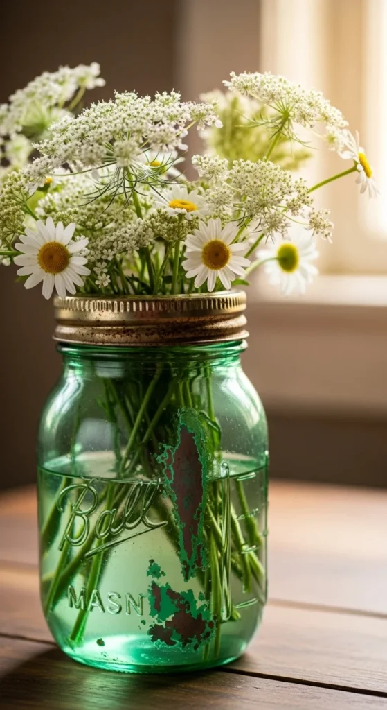 A simple mason jar arrangement is the essence of cottage styling—unfussy, natural, and comforting. Adding white flowers keeps things bright while the green jar adds seasonal charm.
