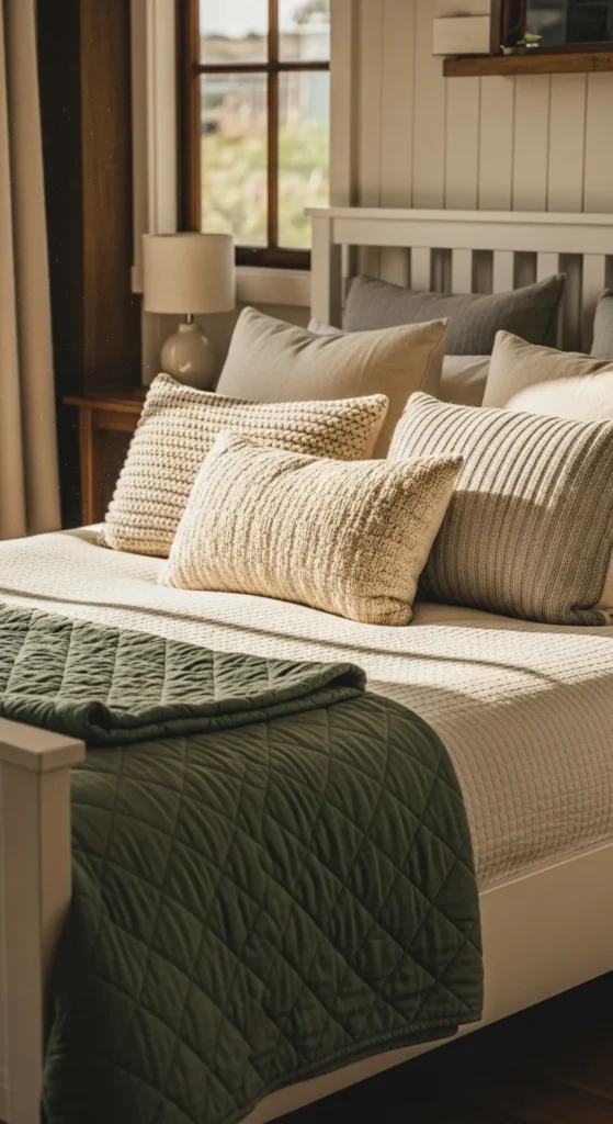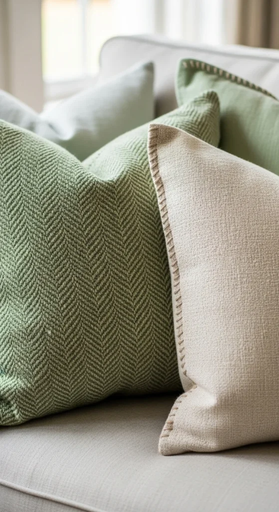3. Add pillows in mixed green and neutral tones.