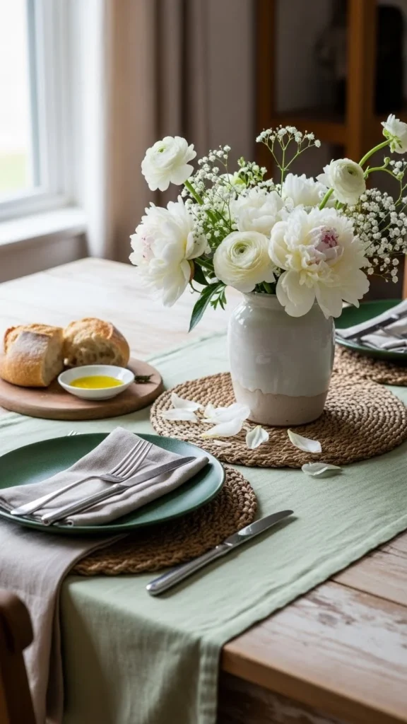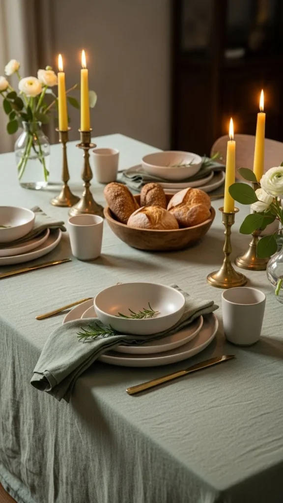 A linen tablecloth in a muted green instantly sets the tone. It feels relaxed yet polished and creates a beautiful base for layering other elements without overwhelming the table.