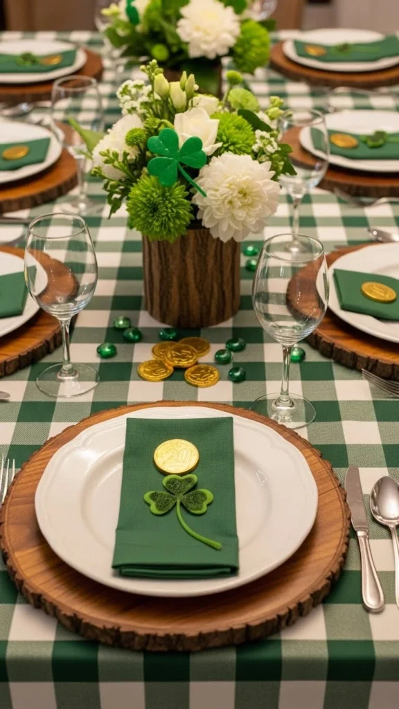 Gold-rimmed plates elevate even the simplest table. They subtly nod to the “pot of gold” theme without being literal.