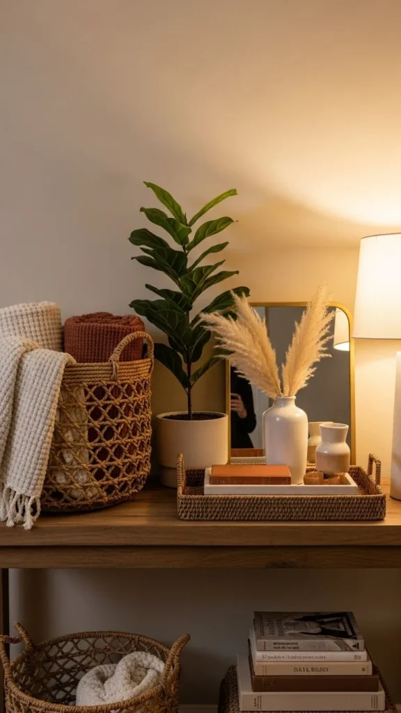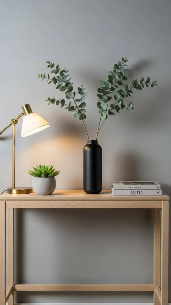 Add a candle for evening warmth. Swap greenery for fresh stems if hosting guests. Keep height low for small spaces.
