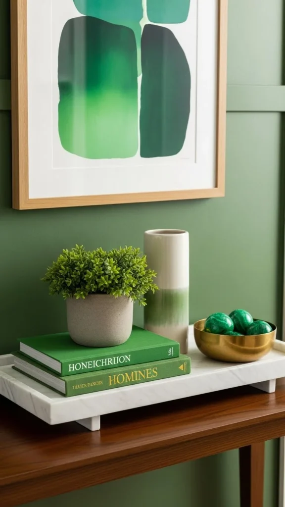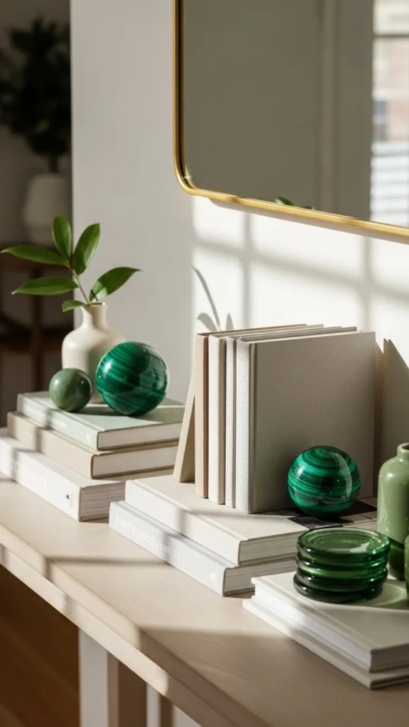 Books add height and personality. Green accents keep it seasonal.