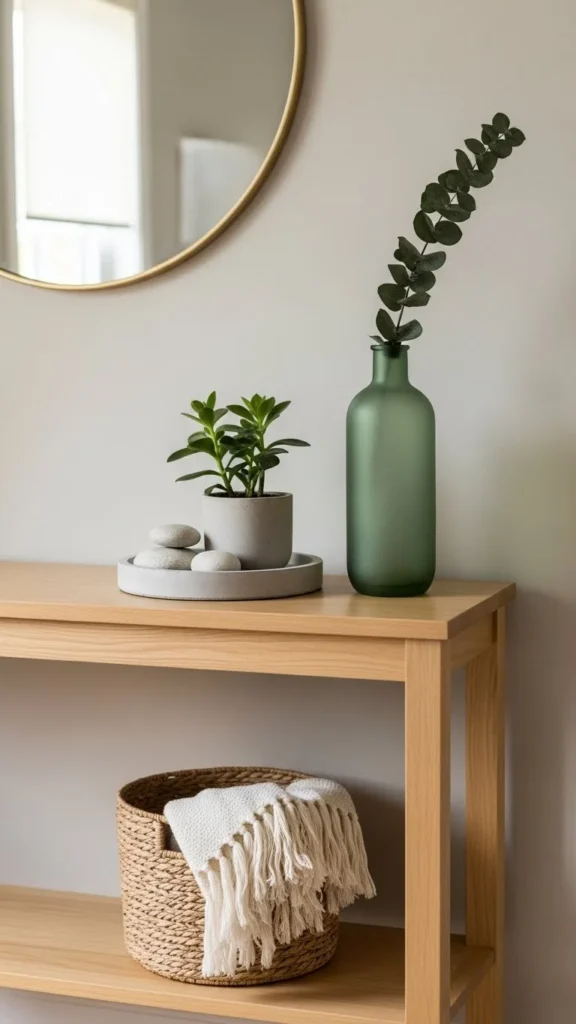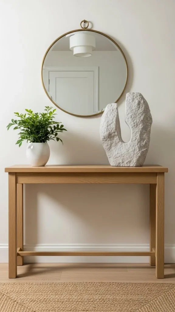 Natural textures instantly feel welcoming. Wood and greenery soften the entry without clutter.