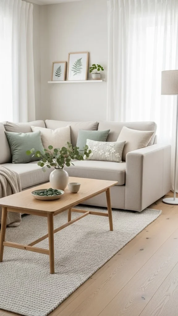Keep the tones soft for a cohesive neutral-green theme.
