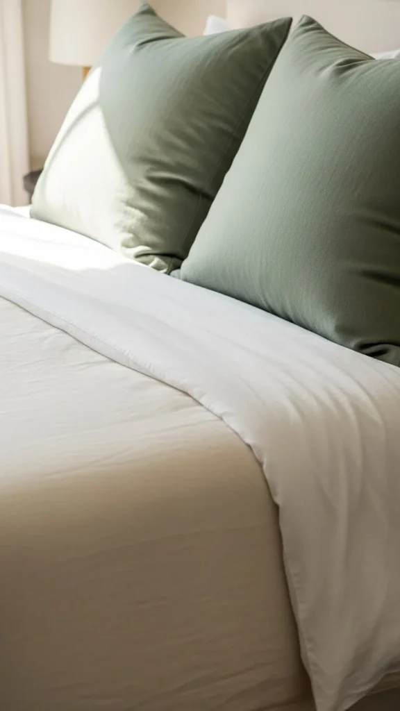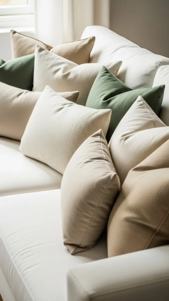 - Add the muted green pillows as accents.