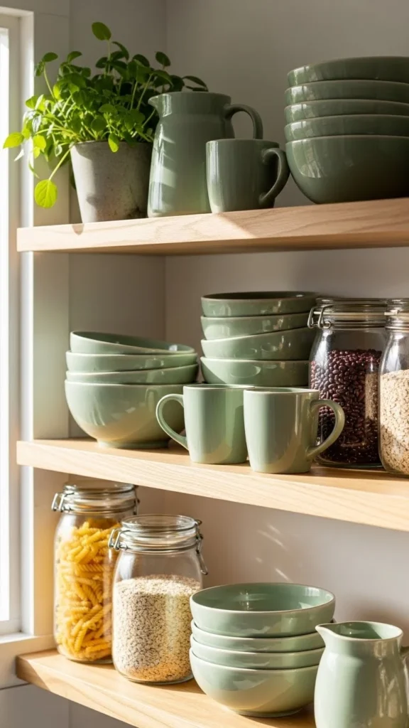 19. Neutral Green Kitchen Shelf Display